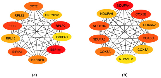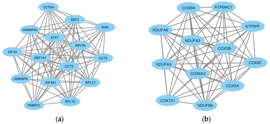 The protein–protein interaction network of the 397 DEGs was constructed with medium confidence using STRING. A PPI network was constructed for the up- and down-regulated DEGs. The obtained files were subsequently visualized by Cytoscape, and their possible subnetworks were analyzed with MCODE to investigate the molecular networks related to these deregulated genes. Up to nine subnetworks were identified for up-regulated DEGs and three subnetworks for down-regulated DEGs. We selected the subnetworks with the highest MCODE scores for up- and down-regulated DEGs. The subnetwork of up-regulated DEGs consisted of 15 genes: EIF4A1, CCT2, ETF1, PABPC1, HNRNPR, EIF3A, EEF2, HNRNPA1, RPLP0, EEF1A1, RAN, RPL12, CCT6A, RPL15 and CCT3 (Figure 3a). The subnetwork of down-regulated DEGs consisted of 12 genes: COX5B, COX6A2, NDUFA4, COX6C, NDUFB4, ATP5MC1, COX8A, NDUFA3, ATP5PF, COX7A1, COX5A and NDUFA6 (Figure 3b).