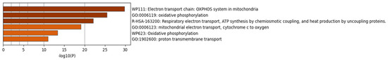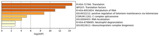 Finally, these subnetworks were enriched using Metascape. Metascape serves as a user-friendly online bioinformatics portal, facilitating the expeditious and precise acquisition of functional enrichment and interactome analysis outcomes from a designated list of genes of interest. The most enriched pathways for the up-regulated DEG subnetwork included translation, translation factors and metabolism of RNA (Figure 4). Conversely, the most enriched pathways for the down-regulated DEG subnetwork comprised the electron transport chain, oxidative phosphorylation and respiratory electron transport (Figure 5).