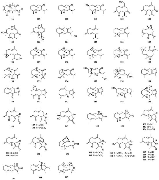 To date, numerous experimental studies have been conducted on the sesquiterpenoids in Curcumae Rhizoma [2,16,17,18]. However, there are fewer reviews on the sesquiterpenoids and their bioactivities in Ezhu. Some reviews primarily focus on a specific activity, including its effects on cancer, hepatobiliary disease, and infectious diseases [9,10,19,20,21], while others concentrate on the differences between several herbs derived from the genus Curcuma (Curcumae Longae Rhizoma, Curcumae Radix, and Curcumae Rhizoma) [6,7]. Accordingly, in this article, we review the sesquiterpenoids derived from the dried rhizomes of C. phaeocaulis, C. kwangsiensis, and C. wenyujin, three sources of Curcumae Rhizoma, and emphasize the structural variances among sesquiterpenoids sourced from diverse botanical origins. Additionally, we also summarize the structural features of different types of sesquiterpenoids and their pharmacological activities, revealing the relationship between structural diversity and activity. These discussions aim to serve as a reference and provide foundational knowledge for the prospective advancement and exploitation of Curcumae Rhizoma.