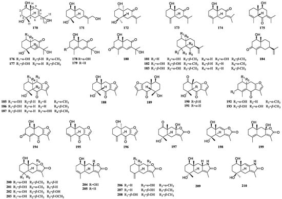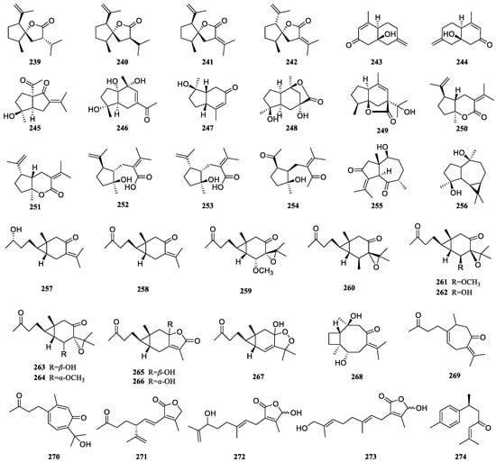 Natural products encompass secondary metabolites crafted by organisms over millions of years of natural evolution, showcasing a plethora of diverse chemical structures. Human life is intricately connected to natural products, serving as a primary source of numerous medicinal drugs or pivotal lead compounds. Sesquiterpenoids are a class of natural products consisting of three isoprene units with structurally diverse basic skeletons. They are derived from farnesyl pyrophosphate (FPP), formed from three molecules of isopentenyl pyrophosphate (IPP), through a series of complex transformations, including cyclization, rearrangement, and oxidation. Although the basic skeleton of sesquiterpenoids contains only 15 carbons, the number of sesquiterpenoids is the highest among terpenoids. Emerging evidence has shown that these compounds have multifaceted biological activities, including, but not limited to, anti-inflammatory, cytotoxic, antitumor, hepatoprotective, and cardiovascular disease-improving properties, both in vitro in cell models and in vivo in animal models [1,2,3,4].