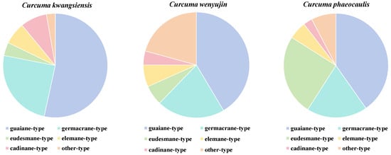 Through modern research, it has been discovered that volatile oil and curcuminoids are the main bioactive constituents of Curcumae Rhizoma, and the volatile oil predominantly comprises sesquiterpenoids [15]. These sesquiterpenoids are of various types, including guaiane-type, germacrane-type, eudesmane-type, elemane-type, cadinane-type, carane-type, bisabolane-type, humulane-type, and other types.