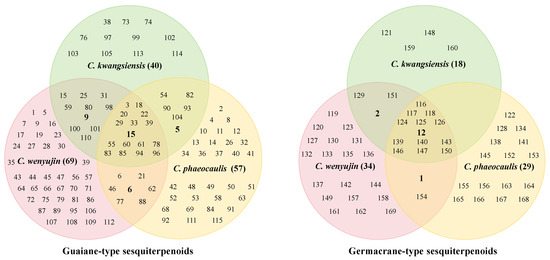 In a comparative analysis of the distribution of sesquiterpenoids across three plant sources, guaiane-type sesquiterpenoids exhibited a predominant presence in C. wenyujin and C. phaeocaulis, with a marked pre-eminence in abundance noted specifically in C. wenyujin. Conversely, bicyclic sesquiterpenoids demonstrated a significant association with C. wenyujin and C. phaeocaulis, while sesquiterpenoids with a furan ring or a lactone ring were mainly found in C. wenyujin and C. kwangsiensis. In addition, while each of the three botanical specimens shares certain chemical constituents, their contents exhibit notable divergence. Specifically, C. kwangsiensis demonstrates a notable enrichment in curcumol (55), while C. phaeocaulis showcases the highest proportions of isocurcumenol (60) and curcumenol (61) among the three plants. These findings highlight the nuanced variations in compound distribution across closely related plant species [23,24,25,26].