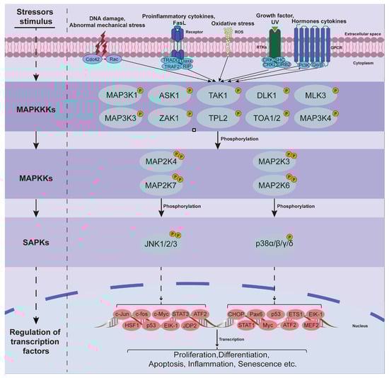Li, L.; Zhang, G.; Yang, Z.; Kang, X. Stress-Activated Protein Kinases in Intervertebral Disc Degeneration: Unraveling the Impact of JNK and p38 MAPK. Biomolecules 2024, 14, 393. https://doi.org/10.3390/biom14040393