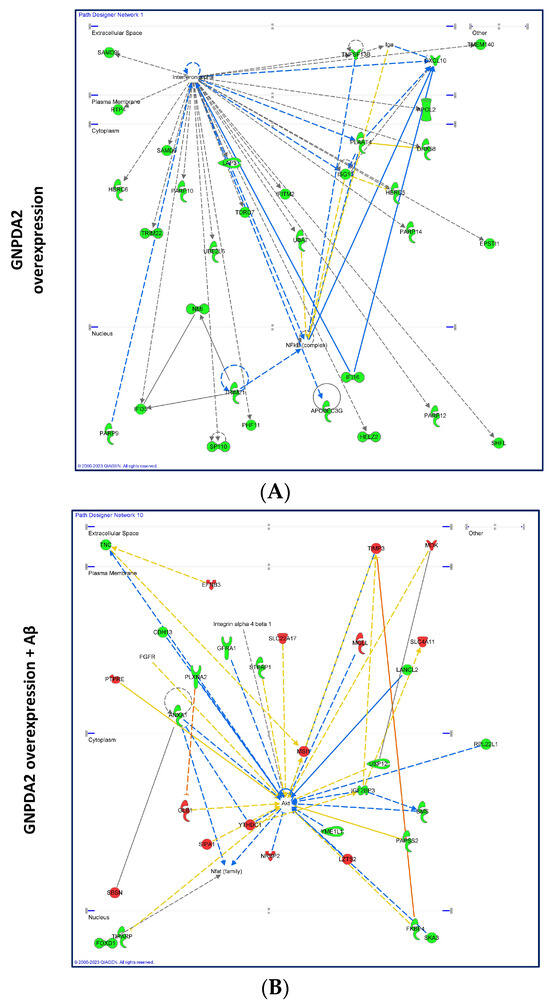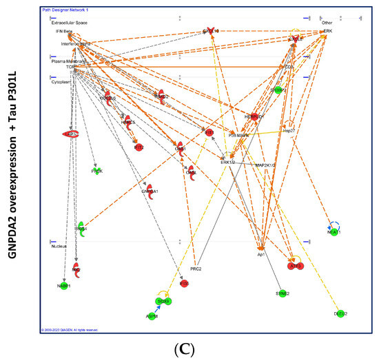 Due to the increased GNPDA2 protein levels, which have previously been observed in neuropathological olfactory-related contexts [13,36], we explored the potential molecular events linked to GNPDA2 overexpression in NECs in the presence of neuropathological insults (beta amyloid (Aβ) and the mutated form of h.Tau P301L). The experimental design is shown in Figure 2A. First, we observed that GNPDA2 overexpression had a positive effect on cell proliferation, accompanied by transcriptomic changes in 172 genes (Figure 2B). On the contrary, the presence of both Aβ and Tau P301L triggered a reduction in the NEC proliferation capacity (Figure 2B). However, Aβ-induced transcriptomic modulation was more severe than that observed in GNPDA2-overexpressing NECs overproducing h.Tau P301L (1879 and 229 differentially expressed genes, respectively; p-value adjusted <0.01), suggesting a synergic effect in the process of neurodegeneration (Figure 2B and Supplementary Table S4). Only 11 were commonly deregulated in the three experimental conditions (Figure 2C). A functional analysis demonstrated that Aβ-impaired biological pathways related to extracellular matrix organization, actin filament-based processes, regulation of cell projection organization and the cellular response to growth factor stimulus, among others, suggesting a negative impact in cell structure and response against external signaling (Figure 2D and Supplementary Figure S2). On the other hand, the concomitant expression of GNPDA2 and h.Tau P301L seemed to interfere specifically with protein processing in the endoplasmic reticulum, PID integrin development, and membrane-bounded organelle assembly, among others (Supplementary Figure S2). To characterize in detail the transcriptomic alterations in the three experimental conditions, transcriptome-scale interaction network analysis was performed. As shown in Figure 3, GNPDA2 overexpression mainly induced downregulation in protein components associated with IFN alpha interactome. On the other hand, the massive molecular disruption accompanying GNPDA2 overproduction in the presence of Aβ mainly revealed alterations in AKT signaling dynamics whereas Tau P301L expression impacted on other survival kinases such as ERK and P38 MAPK (Figure 3).