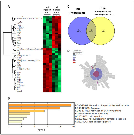 Proteomics in h.Tau P301L zebrafish embryos. (A) Heatmap representation showing differentially expressed proteins (DEPs) between not-injected Tau− and not-injected Tau+. (B) Functional clustering of DEPs between not-injected Tau– and not-injected Tau+ using Metascape. (C) Venn diagram showing DEPs previously described as Tau interactors. (D) Synaptic ontology analysis (subcellular distribution) of DEPs using the SynGo tool.