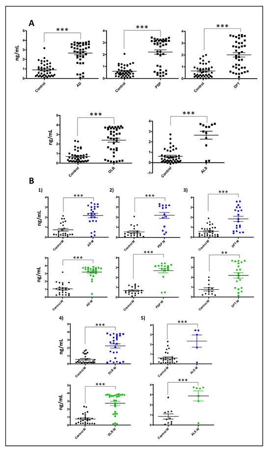 Serum GNPDA2 levels across neurological disorders. (A) GNPDA2 levels measured in the sera derived from 215 individuals with different neurological syndromes. (B) Sex-specific analysis across neurological disorders (71 controls; mean age: 69.2 years; 40M/31F, 40 AD subjects: mean age: 75.1 years; 20M/20F, 40 PSP subjects; mean age: 67.9 years; 15M/25F, 40 DFT subjects; mean age: 69.5 years; 20M/20F, 12 DLB subjects; mean age: 73.5 years; 6M/6F; 12 ALS subjects; mean age: 57.8 years; 5M/7F; ELISA (Mann–Whitney U test; ** p-value < 0.01; *** p-value: 0.001)).