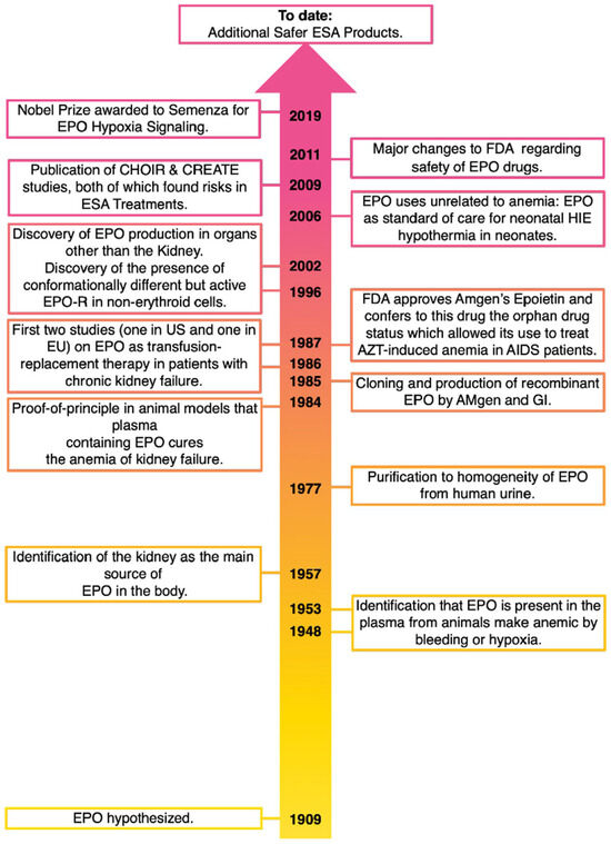That blood contained red blood cells was discovered in the early 17th century by the microscopic observations made by Antoni van Leeuwenhoek, a Dutch cloth merchant with a passion for optics. However, the mechanism(s) that regulates their production in vivo and attempts to exploit them to increase their insufficient numbers (i.e., to treat “anemia”) remained a mystery for some time. Anecdotical treatments of anemia by “stimulators” had already been made by the physicians of the Magna Grecia in South Italy, who used “iron sault” scraped from reddish stones. The debate whether, in addition to transfusion, anemia could be treated by promoting red blood cell production by the body with some type of “substance” began to gather momentum at the beginning of the last century. The hypothesis that the plasma contained a “factor”, defined as hemopoietin, responsible for stimulating the production of new red blood cells was put forward in 1905 by Dr. Paul Carnot and his graduate student, Clotilde Deflandre, of the University in Paris [4]. The routine experience that altitude, more precisely the levels of O2 in the air, reversibly modulate only the number of the red blood cells present in the blood led Drs. Eva Bonsdorff and Eeva Jalavisto in 1948 to define more precisely this factor as ‘erythropoietin’ (EPO) [5]. The formal definition that the plasma from anemic rabbits would increase reticulocyte counts in normal rabbits in a concentration-dependent manner was then provided by Dr. Allan Erslev in 1953 [6], and finally Dr. Jacobson et al. reported in 1957 that EPO is mostly produced by the kidney, the organ in the body best suited to measure the need of the organism for new red blood cell production because it extracts the least oxygen with nearly the greatest blood flow, so that the EPO-producing organ itself is not subjected to metabolic demands and skew erythropoiesis [7] (Figure 1).