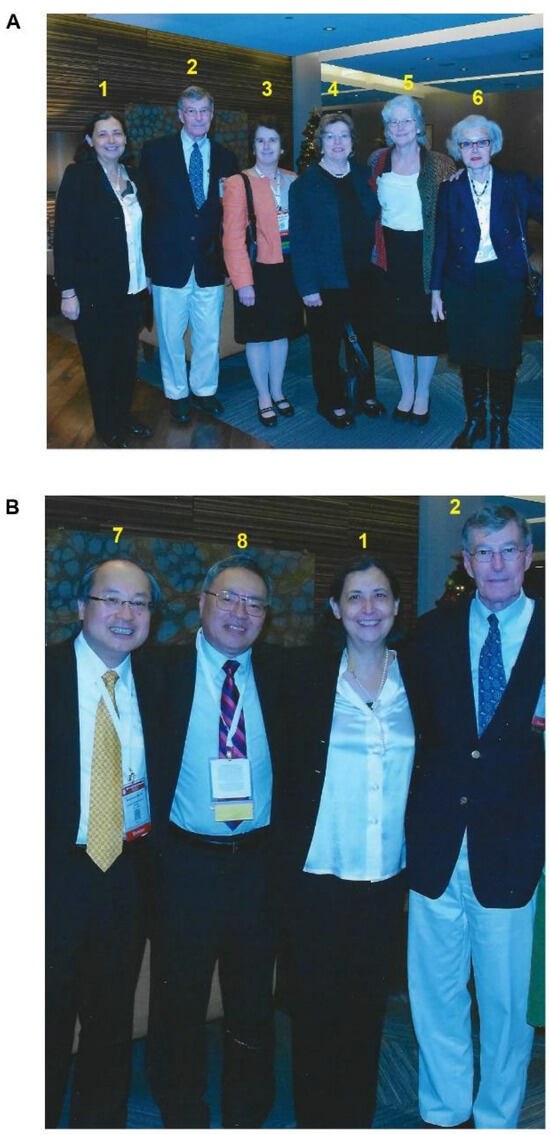 The impressive team of the Division of Hematology, directed by Dr. Adamson, which made an enormous contribution to the discovery of erythropoietin and its clinical application. (A) The Erythropoietin Team of the division of Hematology. (1) Dr. Migliaccio, the author of this review who has collaborated with Dr. Adamson for more than 10 years; (2) Dr. Adamson, the mind behind the clinical use of erythropoietin to treat the anemia of patients with chronic kidney failure; (3) Dr. Janis Abkowitz, who studied the effects of EPO in an animal model of leukemia [56] and succeeded Dr. Adamson as Division Chief; (4) Dr. Rebecca Haley, the clinical fellow who cared for the patients recruited in the first clinical trials with recombinant EPO; (5) Dr. Ginny Browdy, who as clinical fellow purified the human EPO gene [57] and characterized the expression of its receptor on human erythroid progenitor cells [58], and (6) Dr. Thalia Papayannopoulou [59,60]. (B) The Japanese connection. Dr. Adamson (2) with (8) Dr. Akihiro Shimasaka, the Scientific Director of Kirin Pharmaceutics, and (7) Dr. Norio Komatsu, presently a retired Professor of Hematology at Tokyo University, who is just one of the numerous fellows who were supported by Kirin to learn erythropoiesis in the Adamson laboratory. The photos were taken by Dr. Akihiro (Sam) Shimasaka at the dinner organized at ASH 2015 by the past members of the Division to celebrate the mentorship award conferred by the society to Dr. Adamson one year earlier.