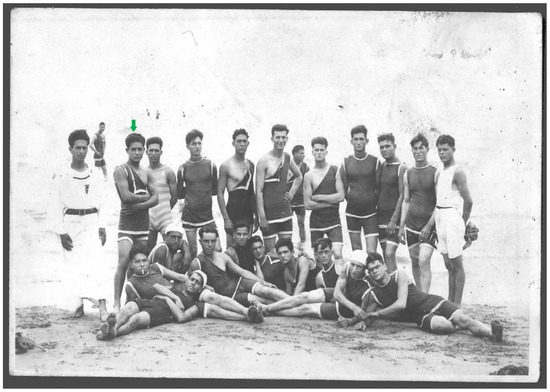 Photograph of an individual heterozygous for the Chuvash mutation highlighting his robust corporature that makes them resilient to fatigue. The arrow points to the father-in-law of the author, who, after having joined the Italian Navy at the age of 16, was sent in 1920 to Tientsin, a Nord-eastern region of China, at that time an Italian colony, as part of a contingent composed of a hand-full of sailors (the other sailors in the photo) in charge of protecting the railroad system against the turmoil of the Chinese revolution [127,128].