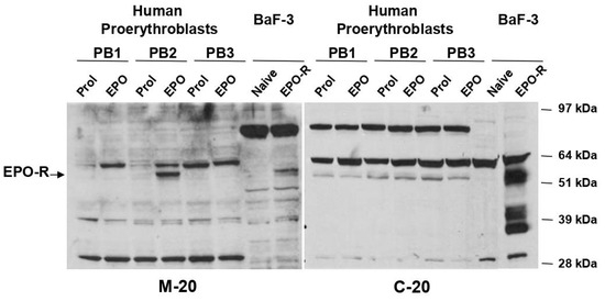 A study conducted by Dr. Steve Elliott at Amgen, however, challenged the specificity for EPO-R of these two antibodies [140], raising concerns that the studies that had detected the receptor in non-erythroid cells may not be valid. We had the opportunity in our lab to test the M-20 and C-20 antibodies against protein extracts of human erythroblasts expanded in vitro using extracts for the BaF3 cell lines overexpressing human EPO-R as control (Figure 5 and [95]). Indeed, the two antibodies detected multiple bands from the BaF3 line overexpressing human EPO-R. The C-20 antibody was clearly superior to M-20 for the lower number of non-specific proteins recognized and for the intensity with which it recognized the EPO-R specific band in BaF3/EPO-R cells (>100-fold higher). However, most of the bands detected by C-20 were not expressed by the naïve cells, raising concerns about whether at least some of them may represent EPO-R degradation products. C-20 also consistently detected two bands of the expected molecular weight for EPO-R [95] that co-migrated with the EPO-R specific band of the BaF3/EPO-R cells in primary erythroblasts obtained from three normal donors. The levels of EPO-R expressed by primary erythroblasts were, however, very low (<100-fold than in BaF3/EPO-R), suggesting that it may be challenging with this antibody to detect EPO-R in non-erythroid cells that express the protein at even lower levels. The band of the molecular weight corresponding to EPO-R detected by both C-20 and M-20 was not expressed by naïve BaF3 cells, confirming that it was EPO-R. In this regard, the 56KD band identified by M-20 was recently confirmed to represent the EPO-R protein by mass spectrometry by Lamon et al. [141]. For its high sensitivity, the antibody C-20 was used to detect EPO-R until recently (see, as an example, [142]).