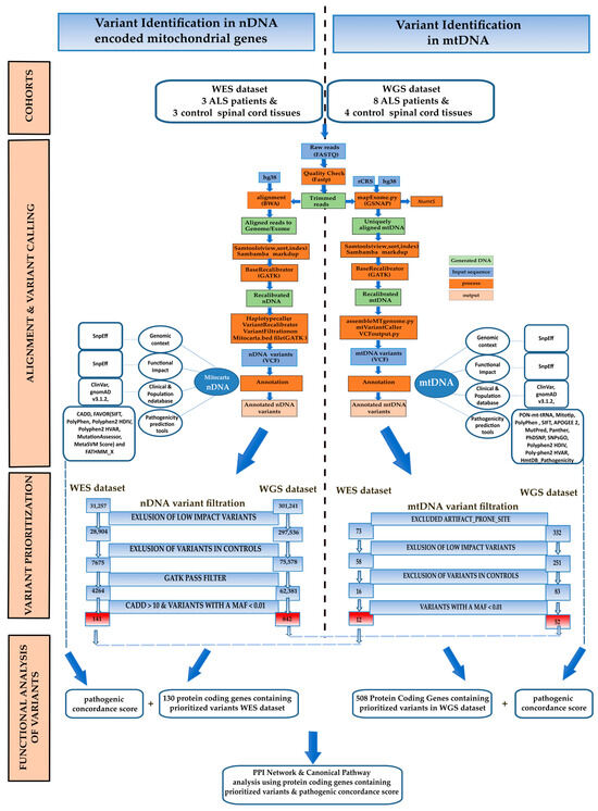 mtDNA inheritance is matrilinear, as the mitochondria from the sperm cell are eliminated by the egg shortly after fertilisation [34]. Mutations in mtDNA can be inherited maternally or can occur randomly during DNA replication or repair. Since every cell has a specific but large copy number (CN) of mtDNAs (mtDNA-CN), mutations can be observed in all (homoplasmy) or only in some copies (heteroplasmy). The ratio between mtDNA copies carrying mutations and mtDNA copies not carrying mutations is called the heteroplasmic fraction (HF). When HF exceeds a certain threshold, heteroplasmy may affect the expression and activity of the oxidative phosphorylation complexes and modulate the susceptibility to mitochondrial-based diseases. The number of mtDNA variants and HF are tissue- or cell-specific and tends to increase with age [35], and somatic heteroplasmic variants that arise during life could play a role in the development of diseases. Furthermore, mtDNA-CN, together with HF, may affect the cell’s overall function [36], but differently from HF, mtDNA-CN has been shown to negatively correlate with age [37]. Targeting mitochondrial dysfunction represents a promising clinical avenue for ALS since it has the potential to extend survival in preclinical models. However, the correct timing of the therapy appears to affect the improvement in survival, with the highest benefit for interventions given before disease onset [38]. Therefore, further insights are needed to elucidate early molecular mechanisms, genes, and variants involved in disease initiation and progression to guide and advise future therapeutic protocols. In this study, we applied a bioinformatics workflow for analysing whole exome/genome sequencing data across two distinct datasets to pinpoint variants potentially associated with ALS both in mtDNA- and nDNA-encoded mitochondrial genes. Since mtDNA heteroplasmy levels vary among cells and across tissues, we specifically focused on the spinal cord, which is known to exhibit dense clusters of abnormal mitochondria in ALS patients [39] accompanied by alterations in mitochondrial oxidative phosphorylation and represents the key location for disease activity [40,41]. We performed an unprecedented screening of this tissue to identify homoplasmic and somatic heteroplasmic variants acquired during life in the spinal cord of ALS patients, with the aim of determining whether this tissue hosts a specific pattern of variants compared to healthy tissues. Our analyses highlighted an increased accumulation of variants in the mitochondrial CR and in genes of the Sirtuin Signalling Pathway, in ALS patients, irrespective of the assay used (WES or WGS). These results not only support, at a molecular level, the beneficial effects of specific natural antioxidants, such as resveratrol, which act on this pathway in ALS preclinical models, but can also be exploited to identify other new potential therapeutic targets in ALS.