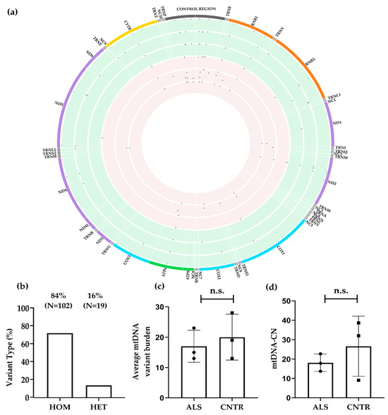 Descriptive statistics of mtDNA variants and mitochondrial DNA copy number (mtDNA-CN) in the WES dataset. (a). Circos plot showing the frequency of 121 mtDNA variants (HF ≥ 0.01) at 73 variable sites in the mtDNA. ALS subjects are represented in red (N = 3), and controls (N = 3) in green. Dots represent variants; relative height within each circle indicates the levels of heteroplasmy (≤95%) or homoplasmy (>95%). Coloured boxes represent functional regulatory elements and genes: control region (dark grey), transfer RNAs (light gray), ribosomal RNAs (orange), Complex I NADH dehydrogenase genes (purple), Complex III cytochrome c reductase gene (yellow), Complex IV cytochrome c oxidase genes (blue), and Complex V adenosine triphosphate synthase genes (green). (b) Percentage of homoplasmic (84%) and heteroplasmic variants (16%). (c) Overall mtDNA variant burden between cases (17.0 ± 5.92) and control tissues (20.0 ± 7.55). (d) mtDNA-CN in three ALS tissues (18.1 ± 4.5) and three control tissues (26.6 ± 15.51). n.s. = not statistically significant.