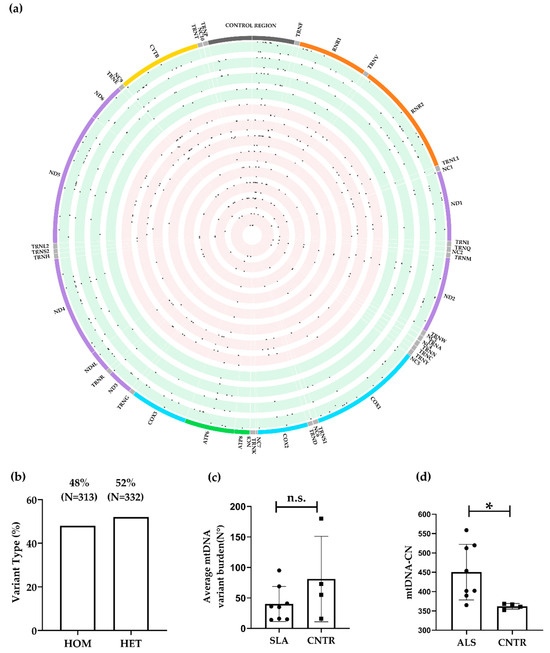 Descriptive statistics of mtDNA variants and mitochondrial DNA copy number (mtDNA-CN) in the WGS dataset. (a) Circos plot showing the frequency of 645 mtDNA variants (HF ≥ 0.01) within 332 variation sites across the entire mitochondrial genome. The red and green shaded circos plots represent cases (N = 8) and controls (N = 4), respectively. Dots represent variants; relative height within each circle indicates the levels of heteroplasmy (≤95%) or homoplasmy (>95%). Coloured boxes represent functional regulatory elements and genes: Control region (dark grey), transfer RNAs (light gray), ribosomal RNAs (orange), Complex I NADH dehydrogenase genes (purple), Complex III cytochrome c reductase gene (yellow), Complex IV cytochrome c oxidase genes (blue), and Complex V adenosine triphosphate synthase genes (green). (b) Pie chart displaying the percentage of homoplasmic (48%) and heteroplasmic variants (52%). (c) Overall mtDNA variant burden between cases (40.13 ± 28.75) and control tissues (81.0 ± 70.16). (d) mtDNA-CN in eight ALS tissues (450.3 ± 71.85) compared to four control tissues (362.0 ± 7.20). n.s. = not statistically significant; * statistically significant p < 0.05.
