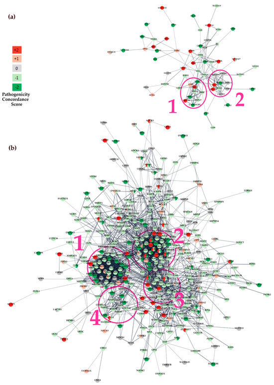 Protein-protein interaction (PPI) networks in genes containing prioritised variants. Red and green nodes represent the concordance score and show predicted deleterious and benign variants, respectively. We assigned a concordance score of +2 if predicted pathogenic by at least four pathogenicity predictors (red nodes); we assigned a concordance score of +1 if predicted pathogenic by up to three pathogenicity predictors (light red nodes). We assigned a concordance score of 0 if it was not predicted by any pathogenicity predictors or if there were conflicting interpretations of pathogenicity (grey nodes). A concordance score of -1 was assigned if classified as benign in up to three pathogenicity predictors (light green nodes) and -2 when all the predictors classified the variants as benign in at least four pathogenicity predictors (dark green nodes); edges are shown as grey. The most significant gene clusters within the network (MCODE score > 6) are marked in pink and numbered. (a) STRING Network constructed using 130 nDNA and mtDNA genes containing prioritised variants in the WES dataset. (b) STRING Network constructed using 508 nDNA and mtDNA protein-coding genes containing prioritised variants in the WGS dataset.