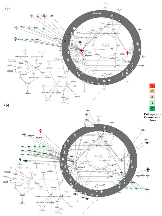 IPA canonical pathway analysis in genes containing prioritised variants. Red and green nodes represent the concordance score and show predicted deleterious and benign variants, respectively. We assigned a concordance score of +2 if predicted pathogenic by at least four pathogenicity predictors (red nodes); we assigned a concordance score of +1 if predicted pathogenic by up to three pathogenicity predictors (light red nodes). We assigned a concordance score of 0 if it was not predicted by any pathogenicity predictors or if there were conflicting interpretations of pathogenicity (grey nodes). A concordance score of -1 was assigned if classified as benign in up to three pathogenicity predictors (light green nodes) and -2 when all the predictors classified the variants as benign in at least four pathogenicity predictors (dark green nodes); edges are shown as grey. Sirtuin Signalling Pathway in the (a) WES dataset and in the (b) WGS dataset. Some genes containing variants were computed by IPA to be part of the Sirtuin Signalling Pathway other genes containing variants were not part of the pathway but were linked to it by direct interactions with the three mitochondrial sirtuins (SIRT3, SIRT4, and SIRT5). We used IPA’s “grow” functionality to add these genes to the pathway analysis. Some genes have been filled with more than one colour because they have different variants with different scores of pathogenicity concordance. * Genes containing more than one variant.