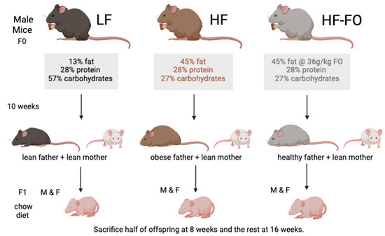 Male and female C57BL6 mice aged 4–5 weeks old were purchased from Jackson Laboratory (Bar Harbor, ME, USA) and acclimatized for one week. Mice were housed in isolator cages with wood bedding. Temperature was maintained at 22 °C with 12 h light/dark period to mimic a natural environment. Male sires (F0 generation; n = 30) were randomly assigned into three dietary intervention groups as shown in Figure 1 (each n = 10): low fat (LF; 13, 28 and 58% energy from fat, protein, and carbohydrate, respectively), high fat (HF; 45, 28 and 27% energy from fat, protein, and carbohydrate, respectively), and high fat with FO (HF-FO; 45, 28 and 27% energy from fat, protein, and carbohydrate along with 36 g/kg of FO). FO was gifted by DSM (Parsippany, NJ, USA). Fish oil at a dose of 36 g/kg of diet was mixed with the rodent diet and supplemented to the mice as hard pellets. Vitamin E was added to the diet to prevent oxidation and food. Diets were purchased from Research Diets (New Brunswick, NJ, USA), with more information provided [21]. The Syracuse University Institutional Animal Care and Use Committee approved all animal protocols.