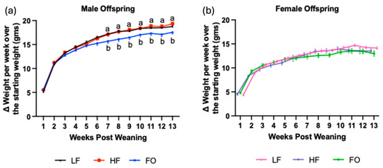 No significant difference was found in body weight between LF, HF, and FO male offspring from weeks 1 to 6 (Figure 2a). However, starting at week 7, offspring mice born to fathers supplemented with FO had significantly lower weight gain than offspring mice born to both LF and HF groups (Figure 2a). Female offspring showed no significant difference in weight gain from baseline between LF, HF, and FO groups over the study duration (Figure 2b). Overall, this highlights that FO supplementation showed significant improvements in male offspring than female counterparts in terms of their body weight.