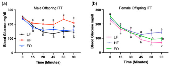 Male and female offspring insulin tolerance tests (ITTs): Blood glucose levels at 10 weeks after insulin injection for LF, HF, and FO groups over a 90 min period, males (a) and females (b). Data presented as mean ± SEM (n = 8–12), p < 0.05. Common letters on the error bars indicate no significance.
