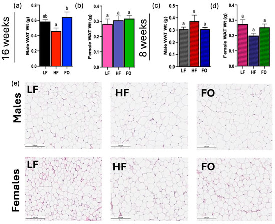 To establish the effect of paternal obesity and FO supplementation on offspring, adipose tissue in offspring was investigated. Most of the fat is accumulated in adipose tissue, thus making analysis of this tissue a clear metric for the extent of obesity and its associated physiological changes. Adipose tissue weight was comparable between the LF and HF groups in 16-week males. The LF and FO groups were also not statistically significant as shown in Figure 4a. However, the FO group had significantly higher adipose tissue weight than the HF group (Figure 4a). There was no significant difference across groups for 16-week females (Figure 4b), 8-week males (Figure 4c), and 8-week females (Figure 4d). Histological analyses of adipose tissue aids in understanding the actions of insulin sensitivity, given that this tissue is a primary target of the hormone. As shown in Figure 4e, male HF offspring had larger adipocyte size compared to LF male offspring. FO reduced adipocyte size in males (Figure 4e). No differences were observed among all female groups, and all groups had smaller adipocytes than males (Figure 4e).
