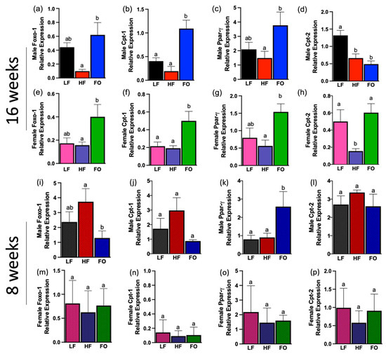 At 8 weeks, FO significantly increased one fatty acid oxidation marker in males, and none in females compared to HF offspring (Figure 5i–p). FO increased Ppar-γ mRNA levels compared to the HF and LF groups in males (Figure 5k). FO significantly lowered Foxo-1 and Cpt-1 mRNA levels compared to HF in males (Figure 5i,j). Lastly, Cpt-2 had comparable mRNA levels in males (Figure 5l). None of the markers were altered in females (Figure 5m–p). Two-way ANOVA results showed a significant difference in sex and diet but no interaction for males and females regarding Foxo-1 and Cpt-1 levels (Table 3).