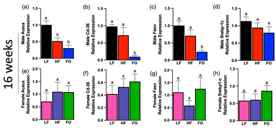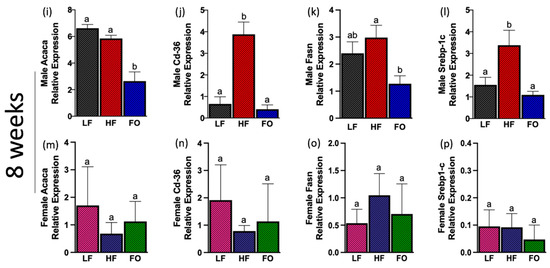 At 8 weeks, FO lowered all four markers in males and none in females compared to HF (Figure 6i–p). The male FO group has significantly lower mRNA expression of Acaca, Cd-36, Fasn, and Srepb-1c compared to the HF group (Figure 6i–l), while all female groups had similar expression for markers of fatty acid synthesis (Figure 6m–p). ANOVA analysis revealed a significant difference in sex, diet, and sex–diet interactions for Srepb-1c (Table 3). No other markers showed a significant association between sex, diet, or their interaction.