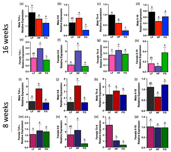 At 8 weeks, FO lowered two of the three pro-inflammatory markers in males and females compared to HF offspring. HF diet significantly increased both Tnf-α and Il-6 in males, while FO significantly lowered Tnf-α and Il-6 mRNA levels compared to HF in males (Figure 7i,j). Tlr-4 levels were not altered by diet in 8-week males (Figure 7k). For anti-inflammatory response in offspring aged 8 weeks, FO significantly increased Il-10 mRNA levels compared to HF in males (Figure 7l). In females at 8 weeks, no difference was observed for Tnf-α mRNA expression (Figure 7m). LF and HF females at 8 weeks had comparable Il-6 mRNA levels, while FO significantly lowered mRNA levels of this marker compared to HF (Figure 7n). HF females had lower Tlr-4 mRNA levels compared to LF, with no difference between FO and HF (Figure 7o). There was a significant difference in Il-6 expression at 8 weeks for sex but not diet or sex–diet interaction (Table 3). Lastly, Il-10 was not altered by diet in 8-week females (Figure 7p). ANOVA further revealed diet and sex–diet interaction for Il-10 (Table 3).