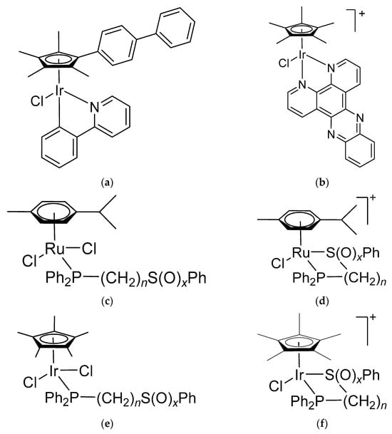 Various iridium(III) (a,b) and ruthenium(II) complexes (structures: (c,d) x = 0–2; n = 1–3; (e,f) x = 0–2; n = 1, 3) with high anticancer activity.