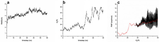 The minimum conformational energy of P4 should be attained during 60 ns of simulation. Relying on one binding/unbinding event may be insufficient because achieving reasonable convergence of the PMF for such flexible ligands is challenging. However, the complete PMF output was followed in this study. Additionally, significant consensus with experimental results (estimated Kd value of ~15 µM in MST) was achieved. Therefore, this approach was retained, and the evaluation of the results was reliable. However, the agreement between the experimental and calculated binding free energies for such a flexible ligand could be a consequence of random error cancellation; therefore, the calculated mean force potential was appraised as semi-quantitative.