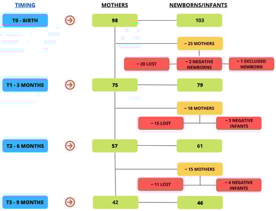 Over the 9-month follow-up period, 75 (76.5%) mothers and 79 (76.7%) babies were checked at T1, 57 (58.2%) mothers and 61 (59.2%) babies at T2, and 42 (42.9%) mothers and 46 (44.6%) babies were able to attend the last follow-up visit at T3. In nine cases, the dyad was not admitted to the subsequent follow-up step because the baby serum was negative for SARS-CoV-2 antibodies at the previous check; one newborn was excluded, as per exclusion criteria, because she had received a blood transfusion. Other withdrawals occurred for personal reasons.