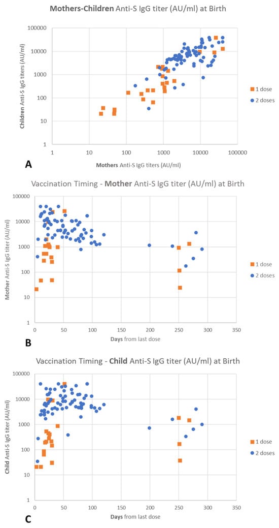 Antibodies at T0 (Birth Time). Orange: one-dose group (n = 24), Blue: two-doses group (n = 74): (A) correlation of maternal/neonatal anti-S IgG titer according to number of doses received by the mother; (B) association between maternal anti-SARS-CoV-2 specific serum IgG and distance (days) from last-dose administration; and (C) association between neonatal SARS-CoV-2 specific serum IgG and distance (days) from last-dose administration.