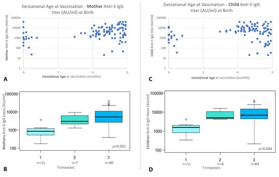 Antibody titers according to vaccination timing: (A) mothers’ antibody titers according to time of vaccination (n = 98); (B) mothers’ antibody titers according to gestational trimester of vaccination (p < 0.001); (C) newborns’ antibody titers according to time of vaccination (n = 103); and (D) newborns’ antibody titers according to mothers’ gestational trimester of vaccination (p = 0.004).