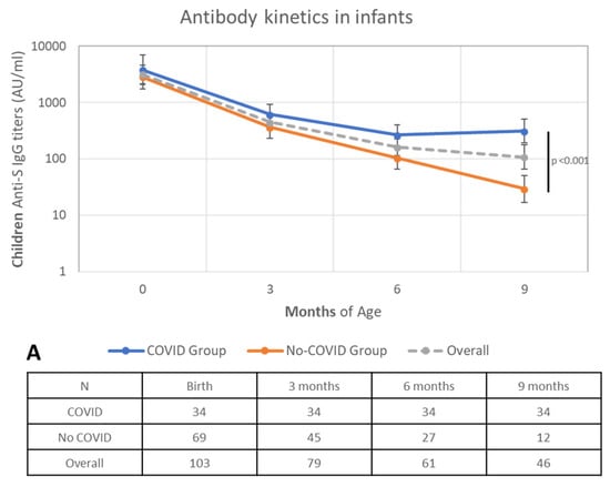 Antibody levels in children have a decreasing trend during the first months of life, but antibodies can be detected until 9 months after birth. For this reason, vaccination in pregnancy may have a protective role in offspring, as well as in pregnant women. Likewise, antibodies may be detected in breast milk [,,], and it is possible that breastfed babies may show a slower drop in antibody serum titers.