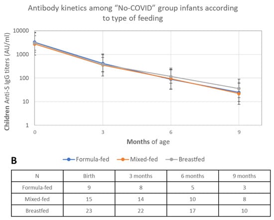 Antibody titers kinetics in infants (geometric mean values) over the 9-month follow-up period: (A) antibody kinetics in infants: COVID Group vs. No-COVID Group vs. Overall; and (B) antibody kinetics among No-COVID Group infants according to type of feeding: formula-fed vs. mixed-fed vs. breastfed infants. N values are reported in the Table below each graph.