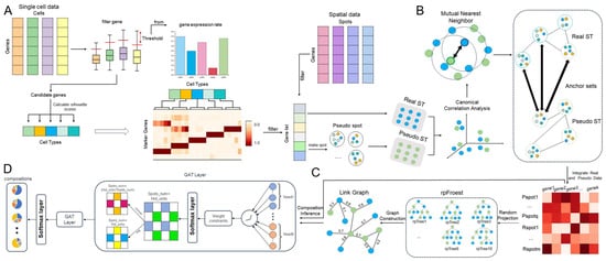 To overcome the limitations of traditional deconvolution methods in deciphering cell type distribution in cancer tissues, we introduce a novel approach named GTADC: a graph-based method for inferring cell spatial distribution in cancer tissues. This method employs a Graph Attention Network (GAT) model for deconvolution []. GTADC utilizes Silhouette scores, a metric based on the similarity and dissimilarity between cell types, to comprehensively capture differential expression patterns within each cell type [,]. This enables a deeper understanding and utilization of cell distribution and arrangement throughout the entire cancer tissue, thereby enhancing the accuracy and comprehensiveness of marker gene exploration. Our method incorporates the Seurat IntegrateData approach [] to eliminate batch effects between generated pseudo-spatial transcriptomics (pseudo-ST) data and real ST data, significantly improving data consistency and comparability [].