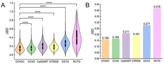 Based on the experimental results, we generated violin plots and bar charts using the Jensen–Shannon distance (JSD) as the metric. In the bar chart, the average JSD of GTADC is significantly lower than other published methods, especially compared to GTAD, indicating superior performance (Figure 2B). The violin plot provides a more intuitive visualization, showing that GTADC has more data points in the regions with lower JSD, implying smaller differences between estimated cell type proportions and actual proportions at these points (Figure 2A). To ensure the reliability of the results, we conducted Wilcoxon rank-sum tests. The Wilcoxon rank-sum test, a non-parametric statistical method, is used to compare the distributions of two independent samples for significant differences []. In comparison to the t-test, the Wilcoxon rank-sum test makes no assumptions about the distribution of data, making it suitable for non-normally distributed data. The results demonstrate that GTADC significantly outperforms other methods in terms of JSD, with all comparisons yielding p-values less than 0.0001, providing strong statistical support for our conclusions.