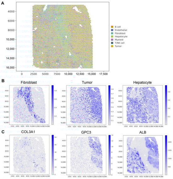 According to the original study, we observed significant distribution differences among the “transition zone” and its adjacent “normal zone” and “tumor zone”. The deconvolution results of GTADC for this cancer are consistent with the literature description (Figure 4B). In the “transition zone”, fibroblasts were mapped to the center of the small sample, clearly distinguishing the cancer and normal areas, aligning with the distribution of its marker gene COL3A1. Tumor cells were significantly enriched on the right side of the sample, consistent with the location of the high expression of the marker gene GPC3, in line with the original study’s description of the “tumor zone”. Hepatocytes were widely distributed in the tissue, scattered in both the “normal zone” and “tumor zone”, with a higher quantity in the “normal zone” than in the “tumor zone”, corresponding to the distribution range of the marker gene ALB (Figure 4C).