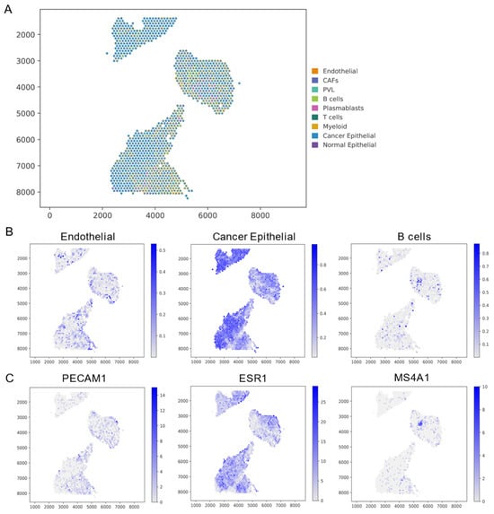 Large-scale tumor genome projects have revealed extensive heterogeneity both between and within tumors []. The widespread application of single-cell RNA sequencing (scRNA-seq) technology has significantly enhanced our understanding of the heterogeneity features of tumor cells at the single-cell level []. However, scRNA-seq still has limitations, as the dissociation of tissues into single-cell suspensions results in the loss of spatial and morphological information, making it challenging to study the spatial structure of tumors [,,]. Spatial transcriptomics (ST) technology overcomes these limitations, providing high-quality whole-genome transcriptomic data with complete two-dimensional positional information [,,,]. Combining ST and scRNA-seq helps overcome the limitations of each technique individually. Nonetheless, inherent limitations exist in spatial transcriptomic analysis, where, in most cases, each point or spot covers multiple cells. Even with high-resolution technology, a small fraction of several cells can be included in the same spatial barcode region. Moreover, tissues with high heterogeneity, such as cancer, consist of various cell types in each small region. There is a causal relationship between specific cell types in the tumor microenvironment (TME) and the state of cancer cells []. Therefore, identifying different cell types in spatial positions within cancer tissues is a crucial task, contributing to understanding the spatial context of pathological physiology.