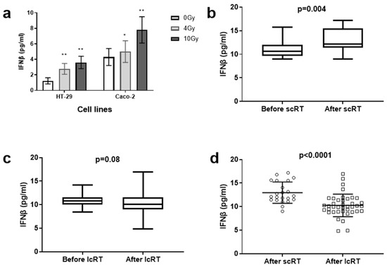 Changes in the mean (±standard deviation) concentration of IFNβ in the supernatant of colorectal cancer cell lines following irradiation with 4 and 10 Gy (* p-value < 0.05, ** p-value < 0.01) (a). Graph presentation of plasma IFNβ levels before and after radiotherapy (RT) in patients treated with short-course (scRT) (b) and long-course (lcRT) (c) RT. Comparison of the IFNβ levels post-RT in the two groups (d). Box and whisker plots show the median value, range, and the 25th and 75th percentiles. Scatter plot shows individual values and mean ± standard deviation.