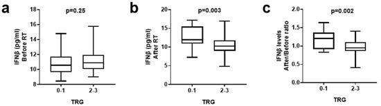 We further compared the IFNβ plasma levels (pg/mL) in two groups of patients according to TRG: TRG 0, 1 (18 patients) vs. TRG 2, 3 (44 patients). Looking into the IFNβ levels before treatment, we found no statistical difference between the TRG groups (median/mean ± standard deviation 10.5/10.7 ± 1.5 vs. 10.9/11.1 ± 1.4, p = 0.25) (Figure 2a). In contrast, the IFNβ levels post-RT were significantly higher in the TRG 0, 1 patient subgroup (11.9/12.7 ± 2.7 vs. 10.2/10.6 ± 2.4, p = 0.003) (Figure 2b). In addition, the ratio of IFNβ levels after/before RT was significantly elevated in patients with TRG 0, 1 (1.2/1.2 ± 0.2 vs. 0.9/0.9 ± 0.2, p = 0.002) (Figure 2c).