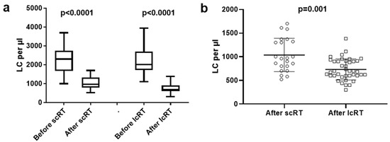 Analysis of the LCs displayed a strong lymphotoxic effect of RT (median/mean ± standard deviation 2303/2230 ± 717 vs. 965/1036 ± 352 before and after scRT, respectively, p < 0.0001; 2008/2239 ± 680 and 690/730 ± 223 before and after lcRT, respectively, p < 0.0001) (Figure 3a). Comparison of the post-RT LCs between the two groups revealed significantly more profound lymphopenia in the lcRT cohort (p = 0.001); Figure 3b.