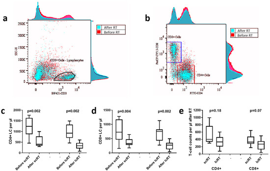 Typical flow cytometry images showing the CD3+ cell (pan T-cell marker) population (a) and the CD4+, and CD8+ T-cell subpopulations in CD3+ T-cells (b), before (red) and after (blue) radiotherapy (RT). Graph presentation of CD4+ lymphocyte counts (LCs) per μL (c), CD8+ LC per μL (d) before and after short-course (scRT) and long-course (lcRT) radiotherapy (RT). (e) shows the comparison of the two T-cell subpopulation counts after scRT and lcRT. Box and whisker plots show the median value, range, and the 25th and 75th percentiles.