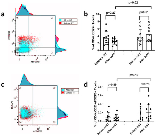 Typical flow cytometry image showing the CD4+/CD25+ T-cell population in CD3+ T-cells, before (red) and after (blue) radiotherapy (RT) (a). Graph presentation of the percentage of CD4+/CD25+ T-cells in CD3+ T-cells before and after short-course (scRT) and long-course (lcRT) RT (b). Typical flow cytometry image showing the CD25+ and FOXP3+ T-cell subpopulations in CD4+ T-cells, before (red) and after (blue) radiotherapy (RT) (c). Graph presentation of the percentage of CD4+/CD25+/FOXP3+ T-cells in CD3+ T-cells before and after short-course (scRT) and long-course (lcRT) RT (d). Box and whisker plots show the median value, range, and the 25th and 75th percentiles.