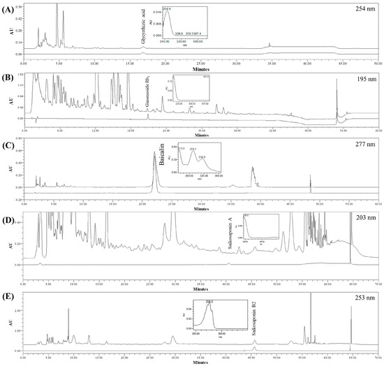 HPLC profiles of SSHT. Glycyrrhizic acid ((A), 254 nm), ginsenoside Rb1 ((B), 195 nm), baicalin ((C), 277 nm), saikosaponin A ((D), 203 nm), and saikosaponin B2 ((E), 253 nm). The upper line represents the SSHT sample, and the lower line represents the standard solution. The concentration of each marker is as follows: glycyrrhizic acid, 62.5 µg/mL; ginsenoside Rb1 and baicalin, 500 µg/mL; and saikosaponin A and B2, 250 µg/mL.