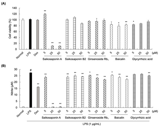 Effect of SSHT components on cell viability and nitrite production in lipopolysaccharide (LPS)-stimulated RAW 264.7 cells. (A) Viability of LPS-stimulated RAW 264.7 cells following treatment with saikosaponin A or B2, ginsenoside Rb1, baicalin, or glycyrrhizic acid. (B) Nitrite levels in LPS-stimulated RAW 264.7 cells treated with saikosaponin A or B2, ginsenoside Rb1, baicalin, or glycyrrhizic acid. Dexamethasone (Dex, 10 µM) was the positive control. Data are presented as the mean ± standard deviation (SD; n = 3). # p < 0.05 vs. normal group. * p < 0.05, ** p < 0.001 vs. LPS group.