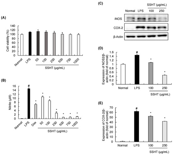 Effect of SSHT on nitrite production and inducible nitric oxide synthase (iNOS) and cyclooxygenase-2 (COX-2) abundance in LPS-stimulated RAW 264.7 cells. (A) Viability of RAW 264.7 cells following treatment with SSHT (50–1000 µg/mL). (B) Nitrite production by RAW 264.7 cells following treatment with LPS or SSHT. Dex (10 µM) was the positive control. (C–E) Abundance of iNOS and COX-2 in LPS-induced RAW 264.7 cells treated with SSHT (100 and 250 µg/mL). Data are presented as the mean ± SD (n = 3). # p < 0.05 vs. normal group. * p < 0.05 vs. LPS group. Original blot images can be found in Supplementary File S1.