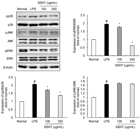 Effect of SSHT on p38, JNK, and ERK phosphorylation and total protein levels in LPS-stimulated RAW 264.7 cells. Cells stimulated with or without LPS were treated with or without SSHT (100 and 250 µg/mL). Data are presented as the mean ± SD (n = 3). # p < 0.05 vs. normal group. * p < 0.05 vs. LPS group. Original blot images can be found in Supplementary File S1.
