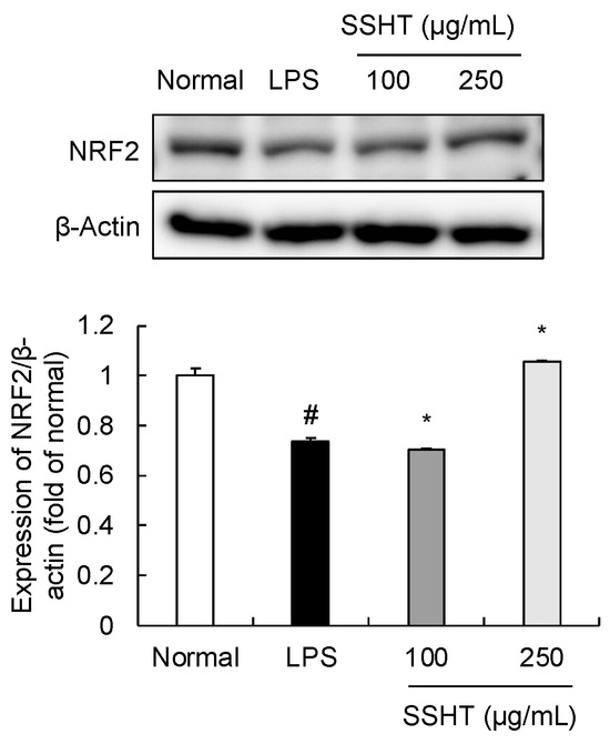 Effect of SSHT on nuclear factor erythroid 2-related factor 2 (NRF2) protein expression in LPS-stimulated RAW 264.7 cells. SSHT treatment (250 µg/mL) reversed NRF2 protein expression. Data are presented as the mean ± SD (n = 3). # p < 0.05 vs. normal group. * p < 0.05 vs. LPS group. Original blot images can be found in Supplementary File S1.