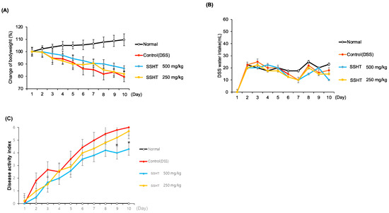 Effects of SSHT on body weight, water intake, and diarrhea status. (A) Body weight changes over 10 days. (B) Water intake. (C) Diarrhea status, scored using disease activity index. Values are expressed as the mean ± SD (n = 5). * p < 0.05 vs. control group.