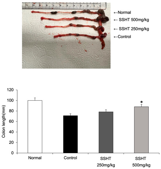 Effect of SSHT on colon length in dextran sodium sulfate (DSS)-induced colitis model mice. Colon length was measured on the last day (day 10 of DSS treatment). The colon was dissected between the ileocecal junction and the proximal rectum, close to the subpelvic passage. The colon was placed on a non-absorbable surface, and its length was measured with a ruler while ensuring that the organ was not stretched. Representatives of one out of three similar independent experiments are shown per group. * p < 0.05 vs. control group.