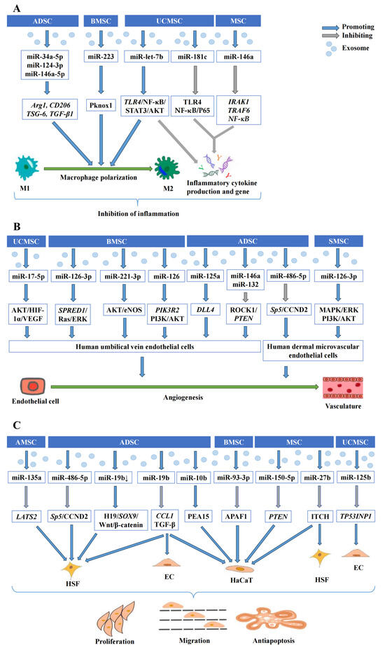 Mesenchymal-stem-cell-exosomes-derived miRNAs are involved in multiple processes of wound healing, including regulating inflammation responses, promoting angiogenesis, and modulating cell proliferation, migration, and apoptosis (Figure 1) [65,66].